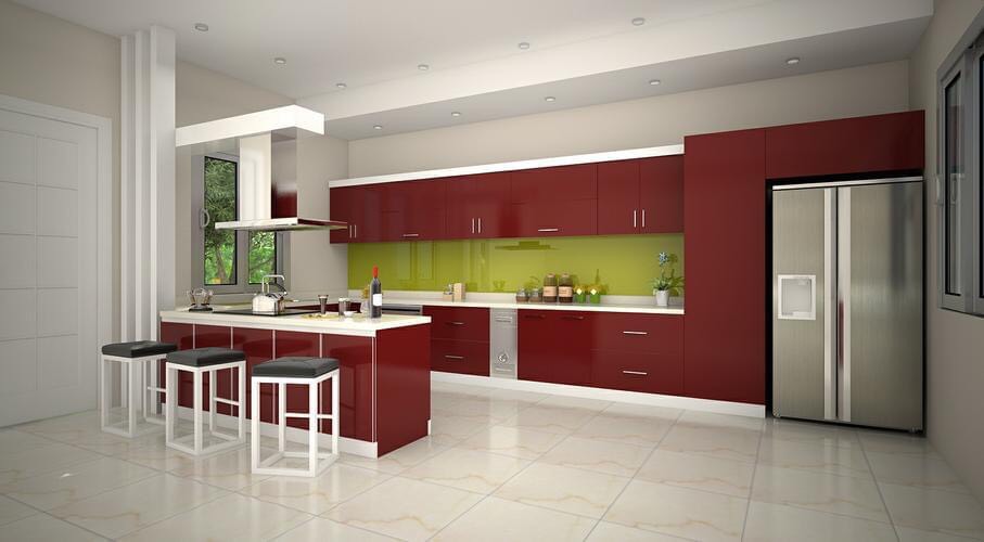 Tủ bếp có quầy bar mini được xem là một món nội thất có thiết kế thông minh với phần quầy bar được tích hợp vào trong tủ bếp. Quầy bar ở bếp dành cho gia đình thường có chiều cao từ 90 đến 115 cm còn chiều dài thì phụ thuộc vào diện tích bộ tủ bếp và cả gian bếp. Mặt bàn bếp quầy bar thường cao hơn bàn bếp khoảng 30cm, thường thì phần quầy bar trong bếp sẽ được tích hợp luôn cả tủ rượu và giá treo ly xinh xắn.