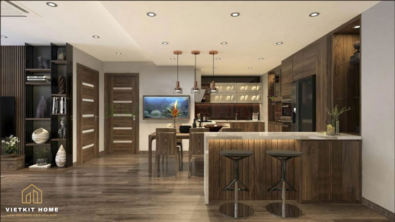 Với mẫu tủ bếp có quầy bar gỗ đẹp hiện đại như trên, không gian nấu ăn của gia đình bạn chắc chắn sẽ tiện nghi và đẳng cấp hơn rất nhiều. Để có được một mẫu có kích thước phù hợp cũng như chất lượng thì bạn phải lựa chọn một đơn vị thiết kế thi công nội thất uy tín. Vietkit Home sẽ là sự lựa chọn tốt nhất cho khách hàng.