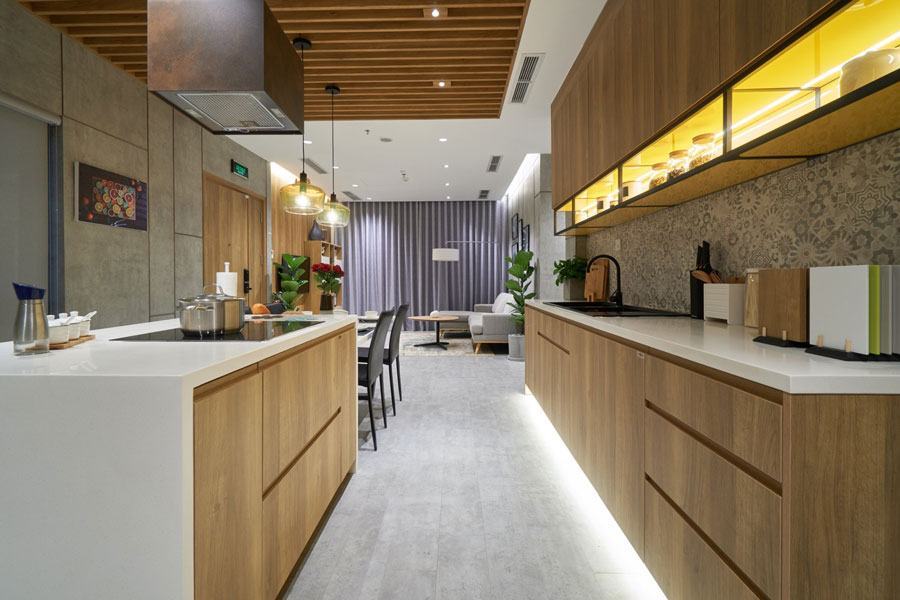 Thông tin cần biết khi chọn tủ bếp inox + cánh gỗ sồi hình chữ I