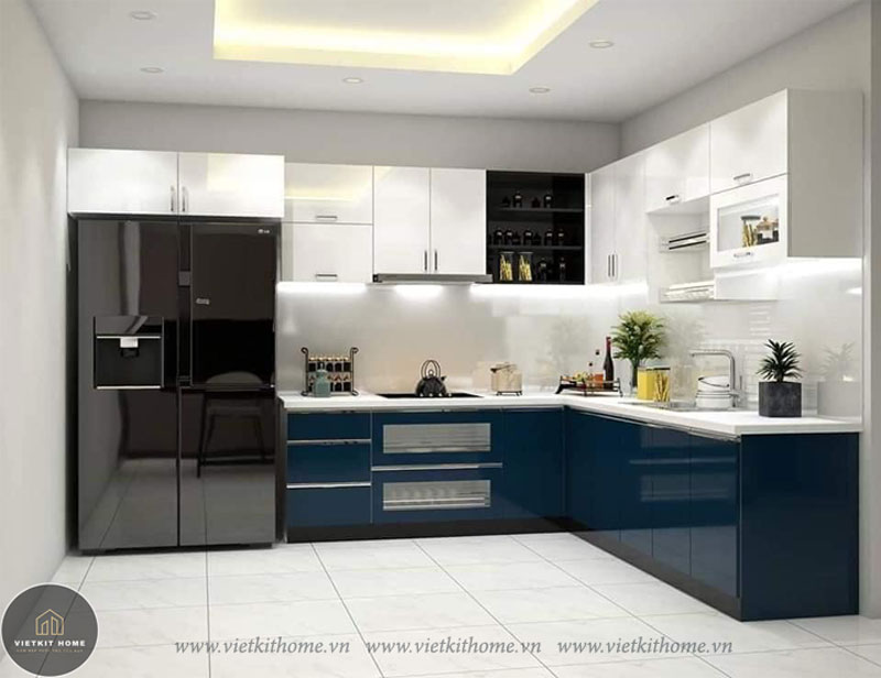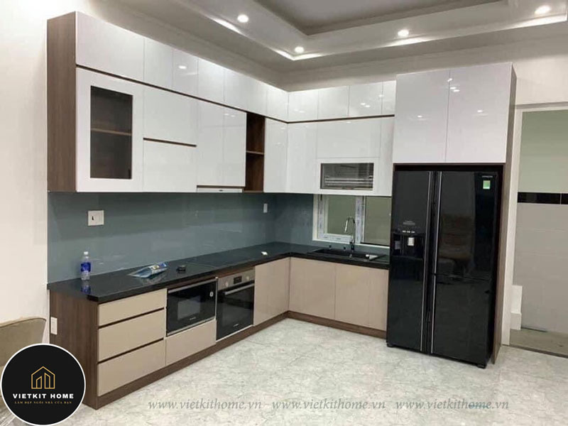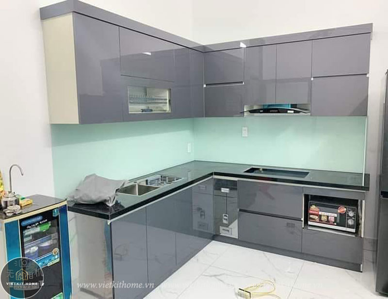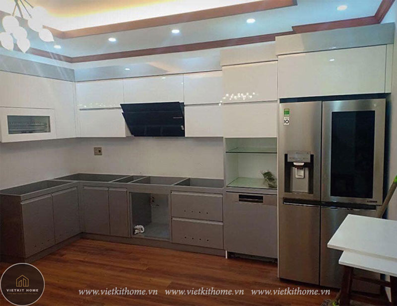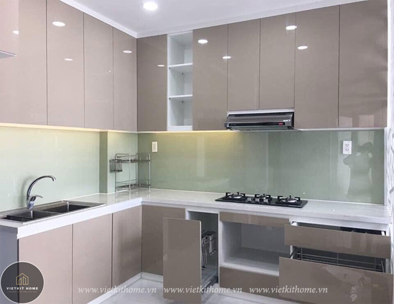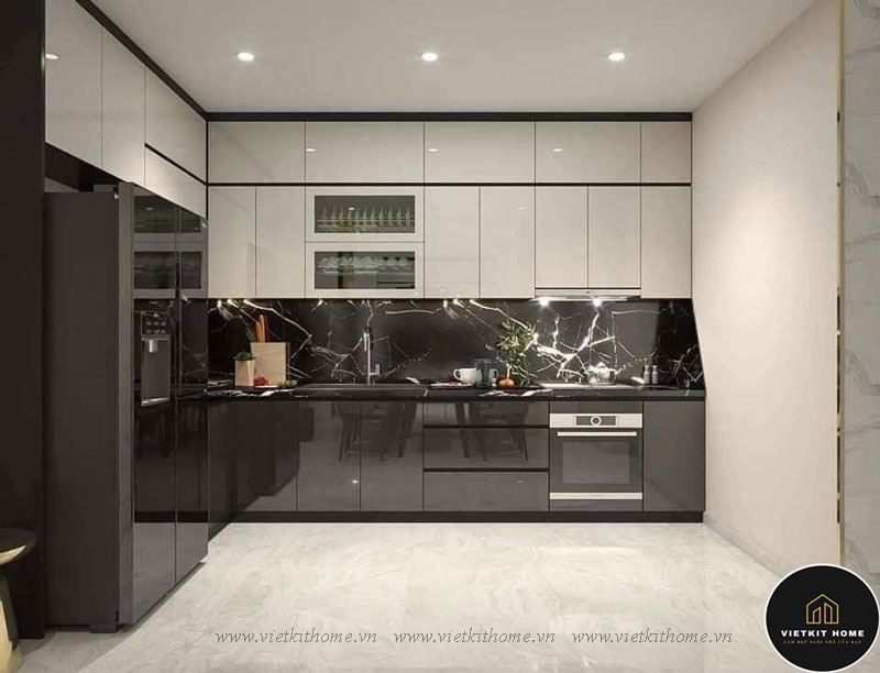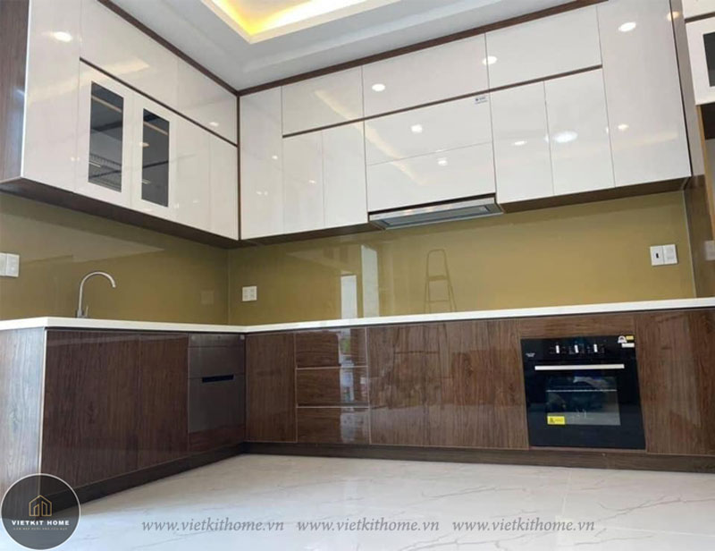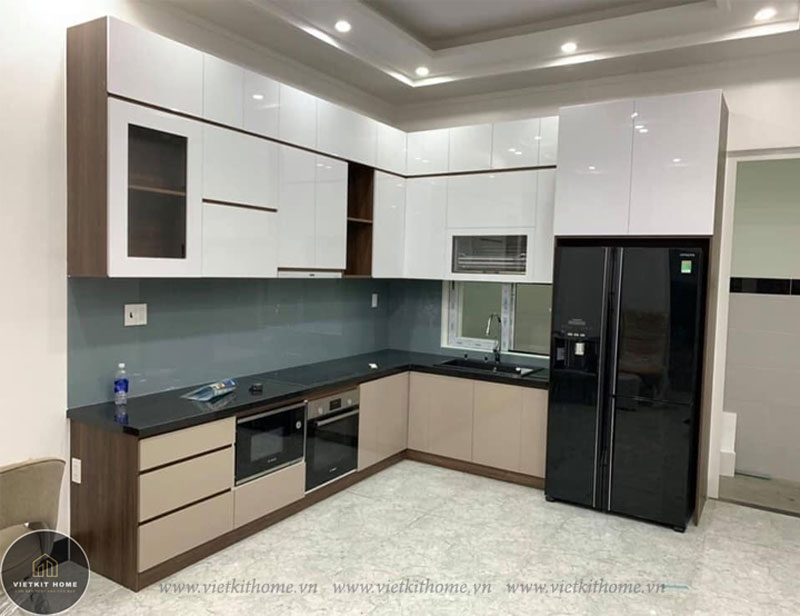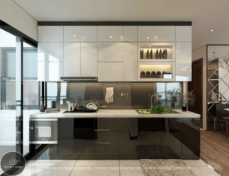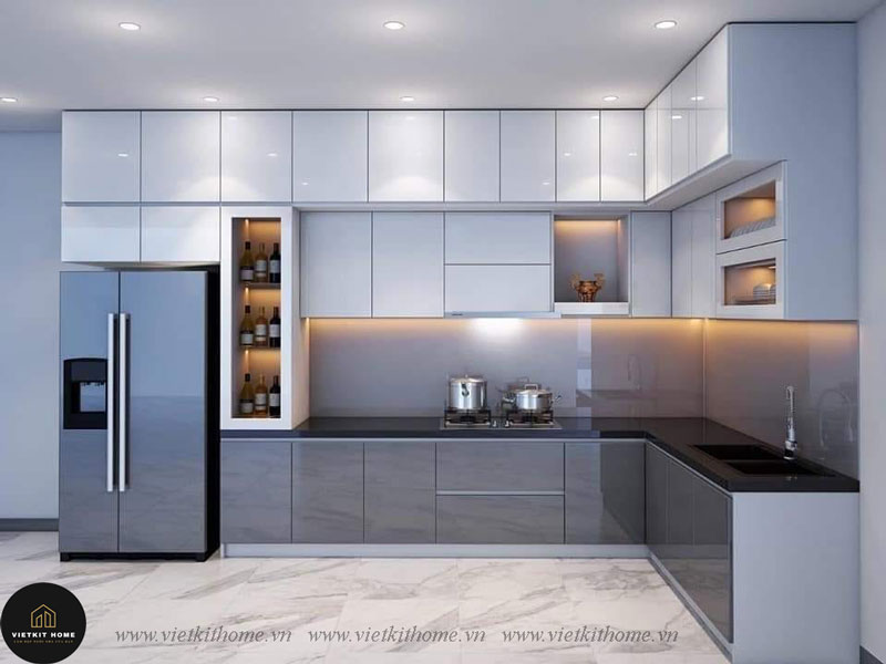 Lời khuyên từ những chuyên gia của Nội thất Vietkit Home: Hãy kết hợp Laminate cho cánh tủ dưới và Acrylic bóng gương cho cánh tủ trên trong bộ tủ bếp thùng Picomat của gia đình bạn để tận dụng tối đa ưu điểm của cả hai chất liệu cánh tủ này.