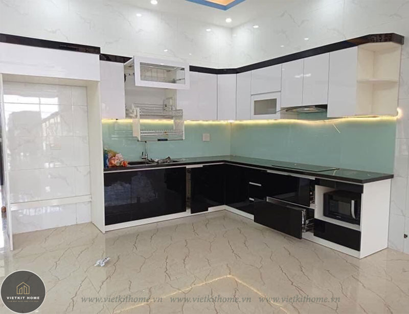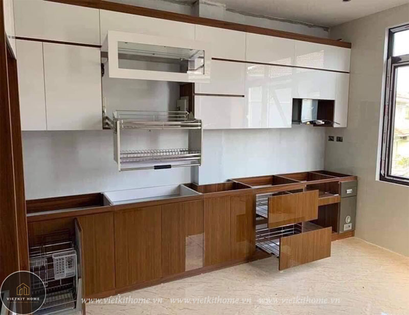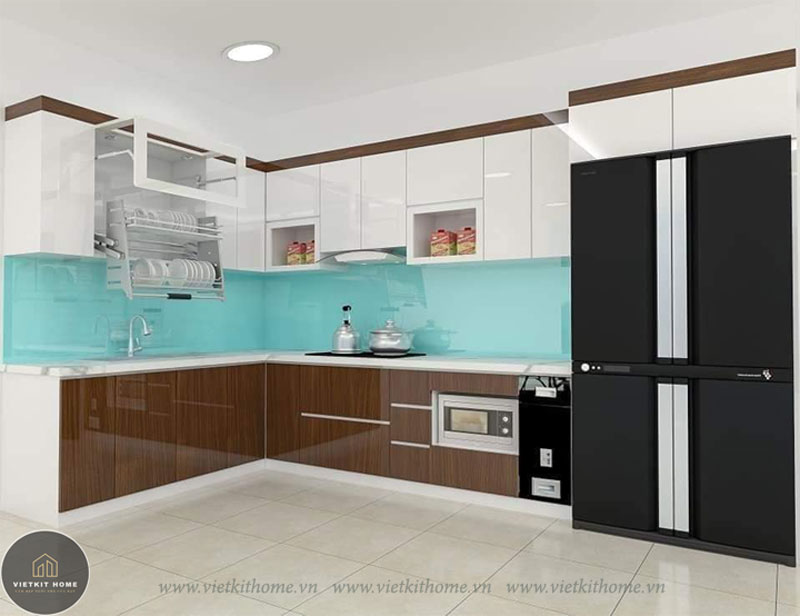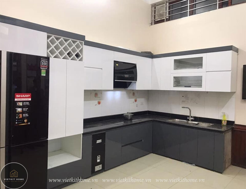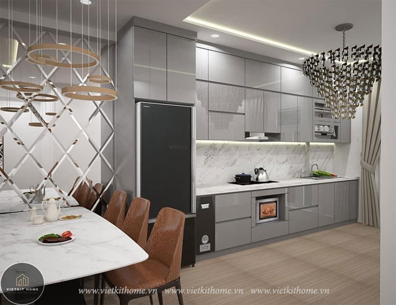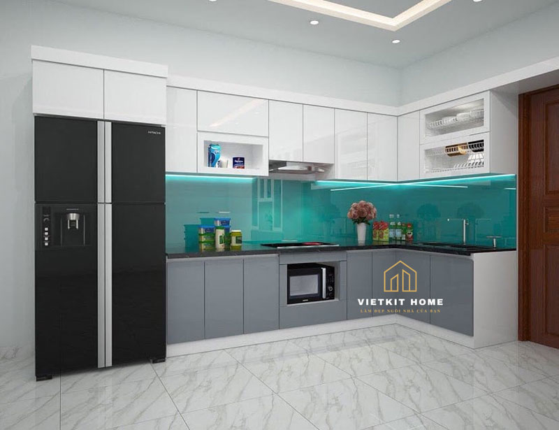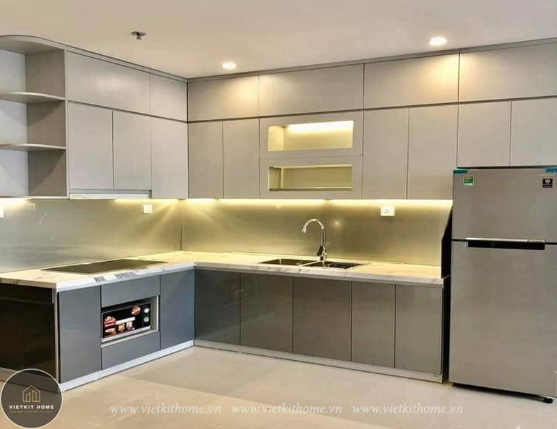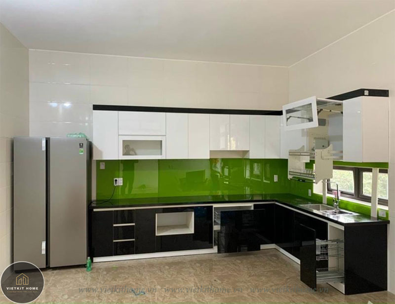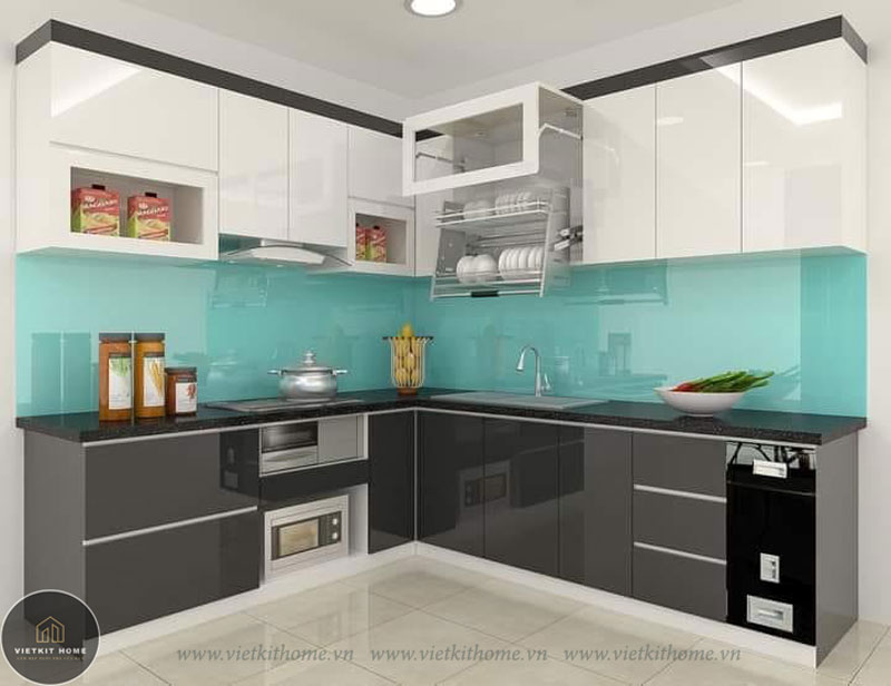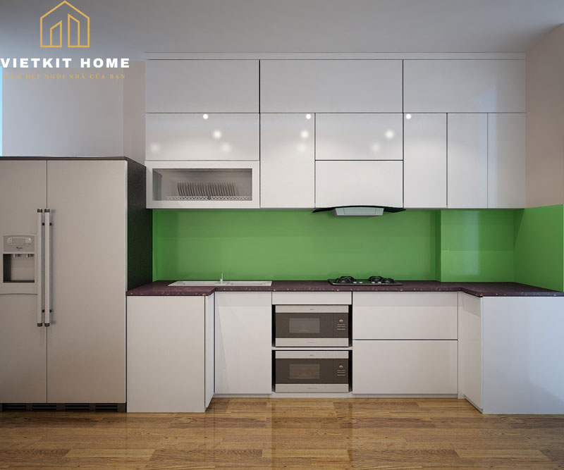 Lời khuyên từ những chuyên gia của Nội thất Vietkit Home: Hãy kết hợp Laminate cho cánh tủ dưới và Acrylic bóng gương cho cánh tủ trên trong bộ tủ bếp thùng Picomat của gia đình bạn để tận dụng tối đa ưu điểm của cả hai chất liệu cánh tủ này.