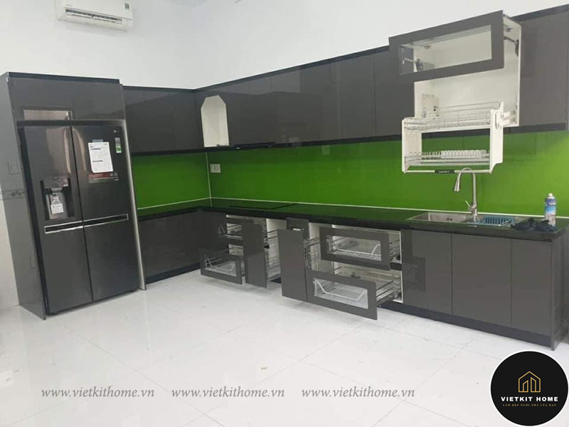 Tủ bếp thùng nhựa Picomat cánh Acrylic là một sản phẩm thường xuyên được yêu cầu thiết kế, thi công từ khách hàng tại Nội thất Vietkit Home. Cánh Acrylic có độ bóng cao, cho sự tương phản màu sắc, bạn có thể chọn cánh Acrylic màu trơn hoặc Acrylic vân gỗ đều cho sự sang trọng, hiện đại với bộ tủ bếp nhà mình.